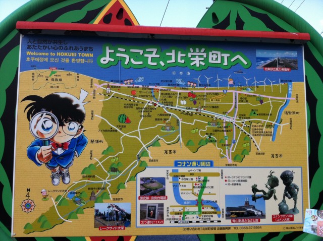 Tottori adalah nama tempat di mana semua tentang Conan ini lahir. Hampir di sepanjang jalan kota dihiasi karakter berbagai tokoh dari komik Conan, mulai dari buku, stiker, boneka, souvenir, poster pinggir jalan, berbagai macam patung Conan hingga penutup selokan berhiaskan karakteristik tentang Conan.